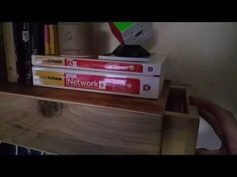 Secret compartment shelf in poplar and birch plywood finished with linseed oil. French cleat mounting for floating effect. Pop-out mechanism dug out of Ikea’s spare parts catalog.